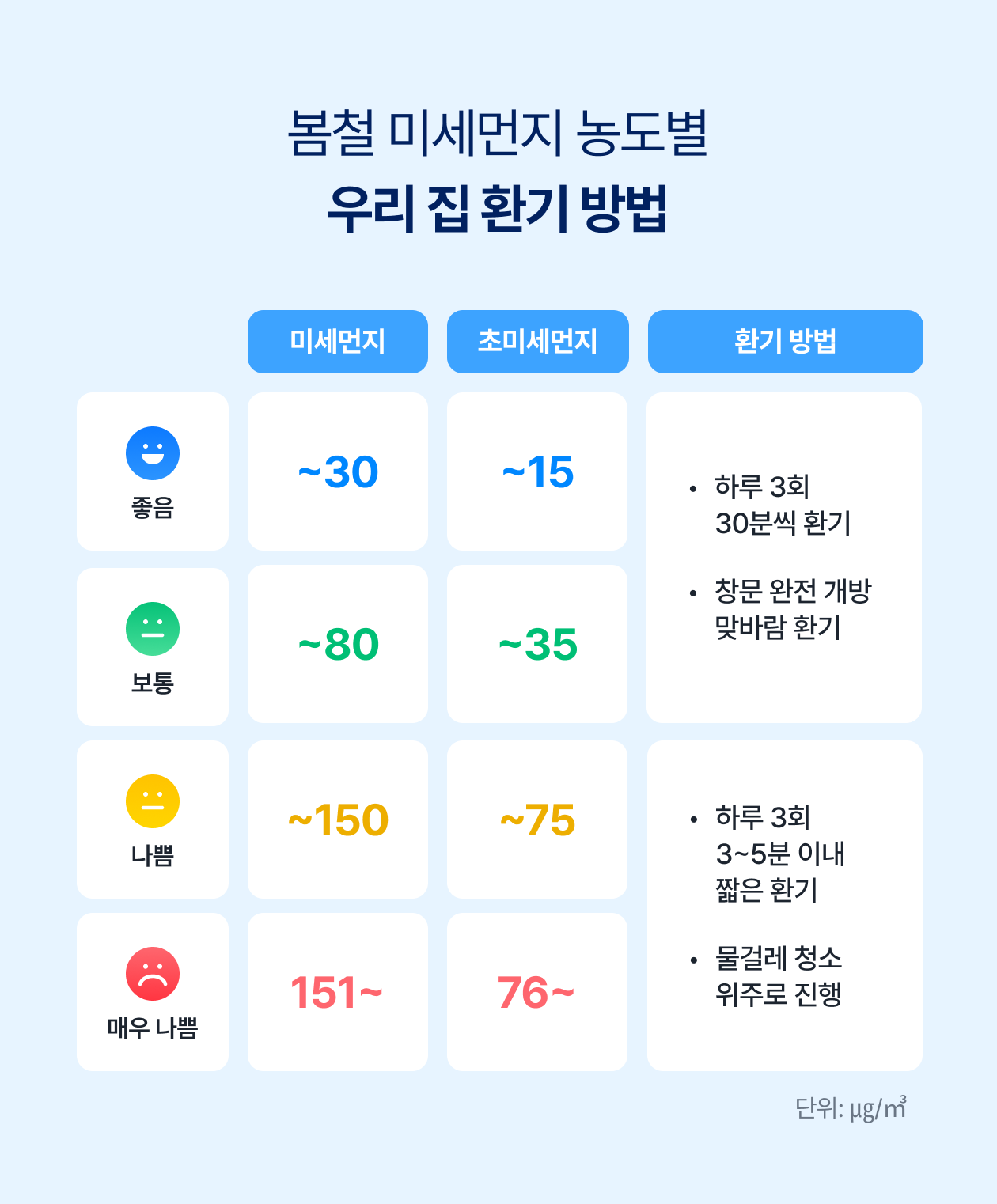 3월은 초미세먼지 농도가 높고 연중 '나쁨' 일수가 가장 많은 달입니다. 그래서 더욱 세심한 관리가 필요한 시기인데요. 미세먼지 농도에 따라 환기 방법도 달라져야 한다는 사실, 알고 계셨나요? 우리 집 공기질을 똑똑하게 관리하는 환기 노하우를 지금 알려드릴게요.